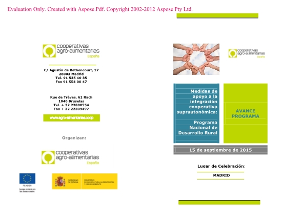 Cooperativas Agro-alimentarias de España y el Ministerio de Agricultura, Alimentación y Medio Ambiente (MAGRAMA) organizan la Jornada "Medidas de apoyo a la integración cooperativa suprautonómica: Programa Nacional de Desarrollo Rural”, que se celebrará el próximo 15 de septiembre en Madrid, y que pretende mostrar a las cooperativas los instrumentos que tienen a su alcance para conseguir formar grupos cooperativos supraautonómicos, así como conocer las bases para el reconocimiento de EAPs.